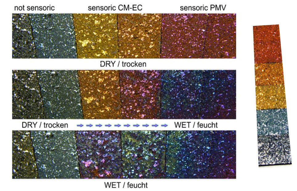 A multi-nano-layer indicates humidity or water contact via a reversible color change. Available on various polymer films e.g. PET, OPP as well as on printable glitter pigments. Also direct coating of materials with the humidity sensitive layer is possible.