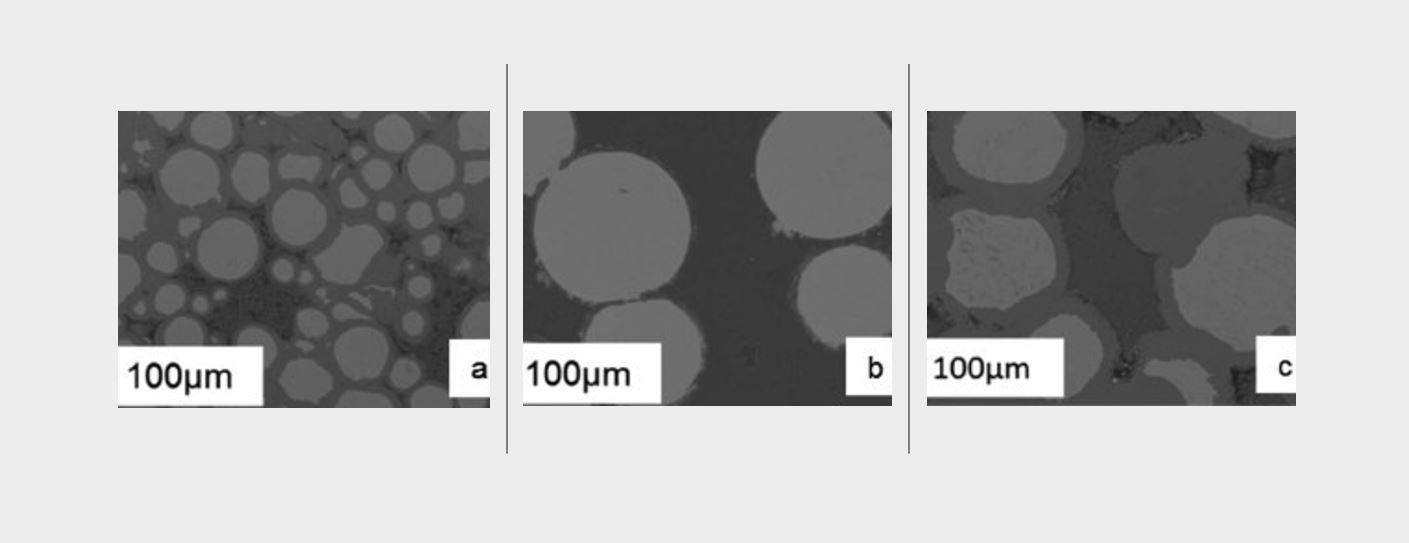 By selecting a proper Ti powder and using short hot pressing cycles denseness and finely distributed Ti-Al materials with a limited amount of intermetallic phases could be consolidated. The picture shows three different Ti-Al samples. Sample (a) is consolidated with a rapid hot pressing technique and with a finer Ti powder. Sample (b) is also consolidated with a rapid hot pressing technique, but with larger Ti particles. Sample (c) is, like (b), consolidated with larger Ti particles, but with a much longer hot pressing cycle (typical for conventional resistance heated hot pressing). The three samples indicate that both particle size and cycle time are essential parameters in the forming of a dense Ti-Al material with a limited amount of intermetallic phases.